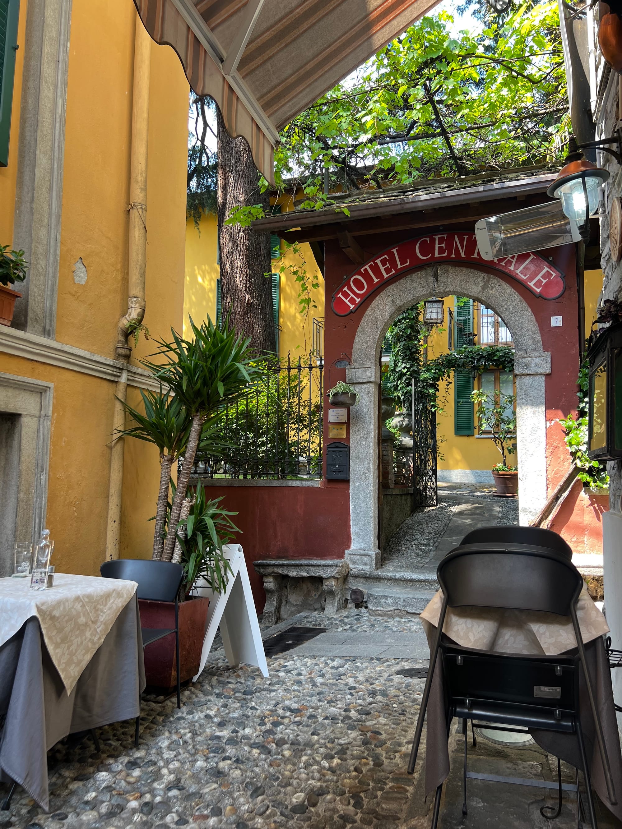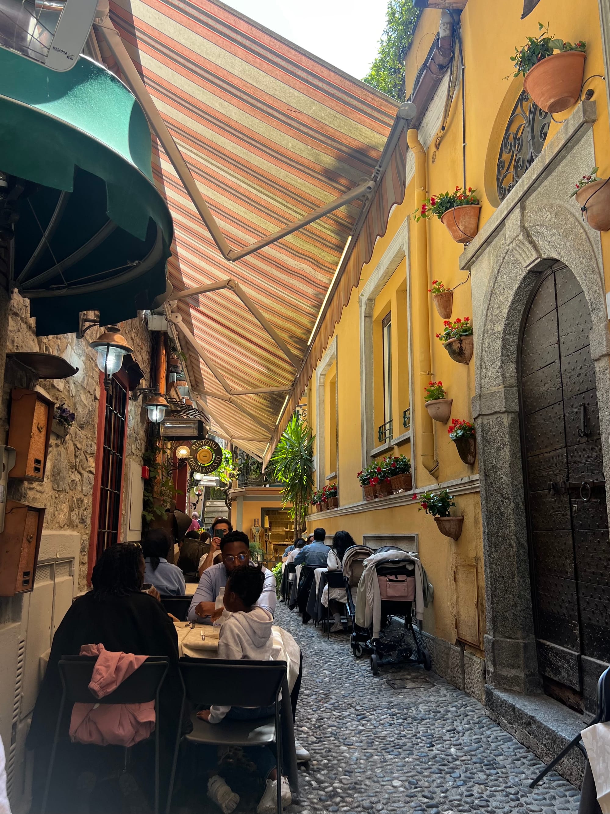 We had started to video us arriving into this beautiful town as the ferry pulled up to the dock. My daughter and I stepped off the ferry and there was a buzz in the air — people sitting, enjoying a drink and food at the waterfront promenade, watching the ferries transporting people across the lake. It was really warm now, so we decided to look for a nice little restaurant that was less busy than the promenade to have something to eat.