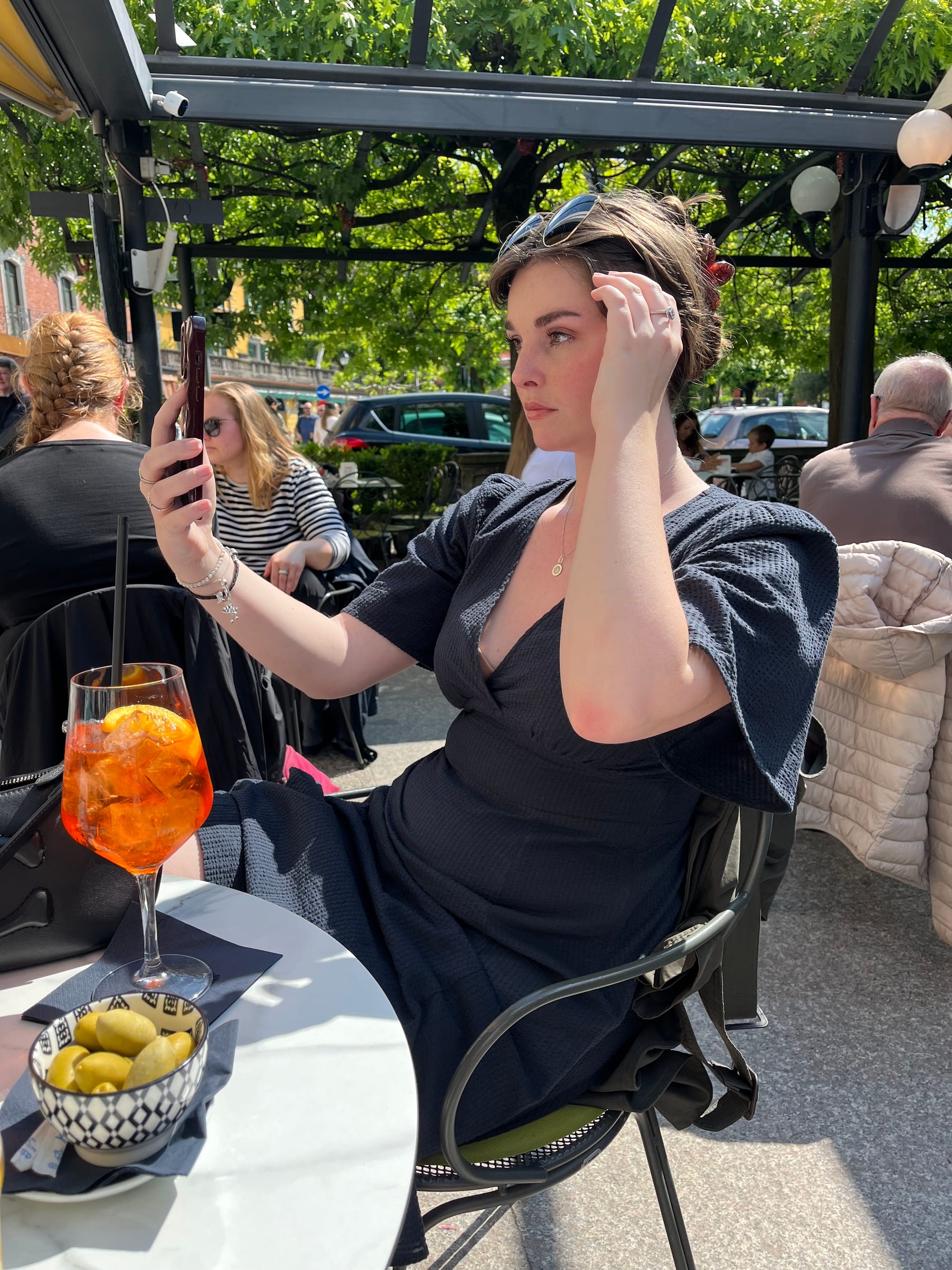 We found a table as the waitress came to greet us. We ordered two Aperol Spritz, which my daughter had recommended — a bitter-sweet cocktail that has become a symbol of Italian aperitivo culture. It consists of Prosecco, Aperol and a splash of soda water. It tastes amazing and is now one of my favourite cocktails!