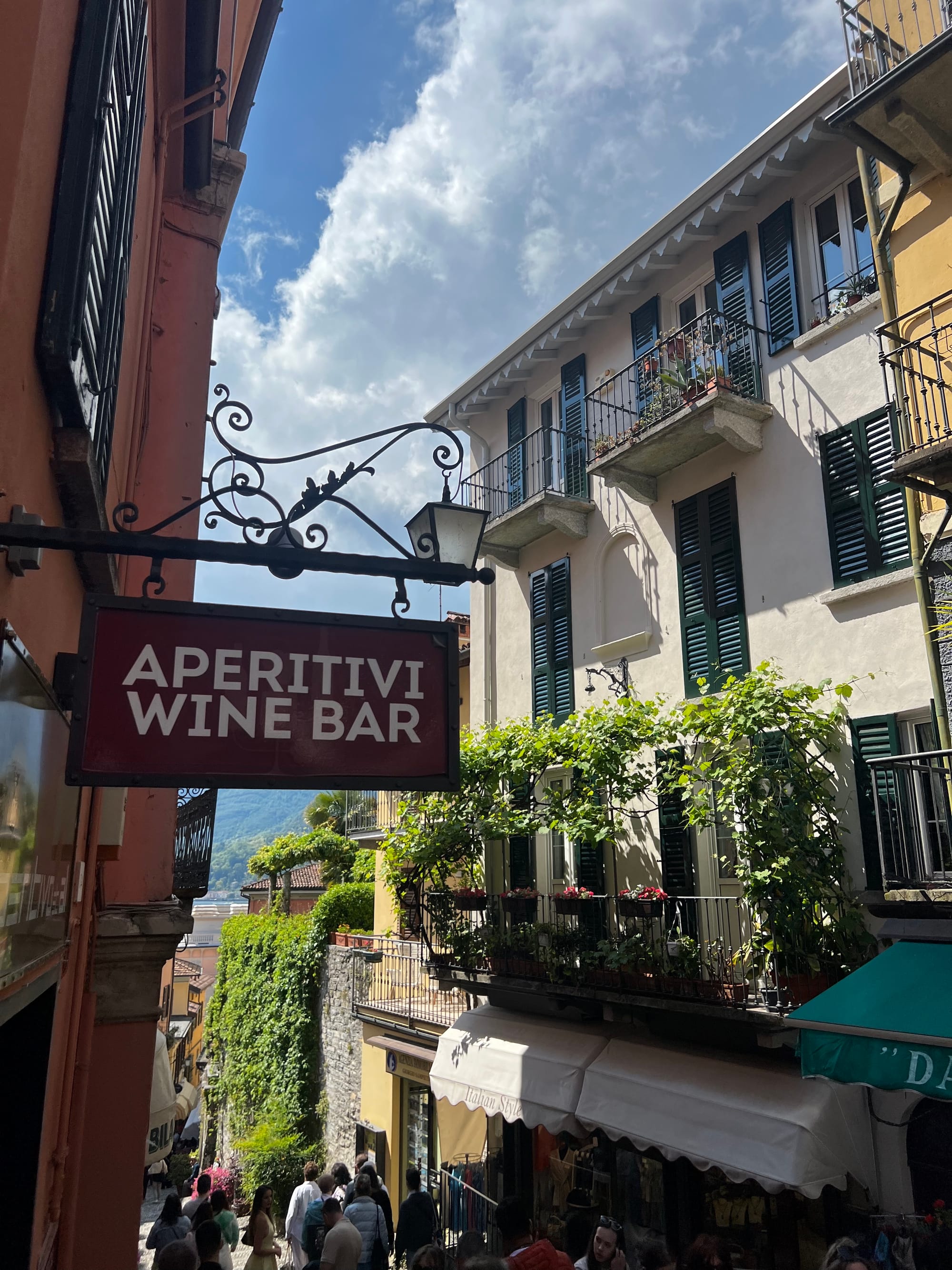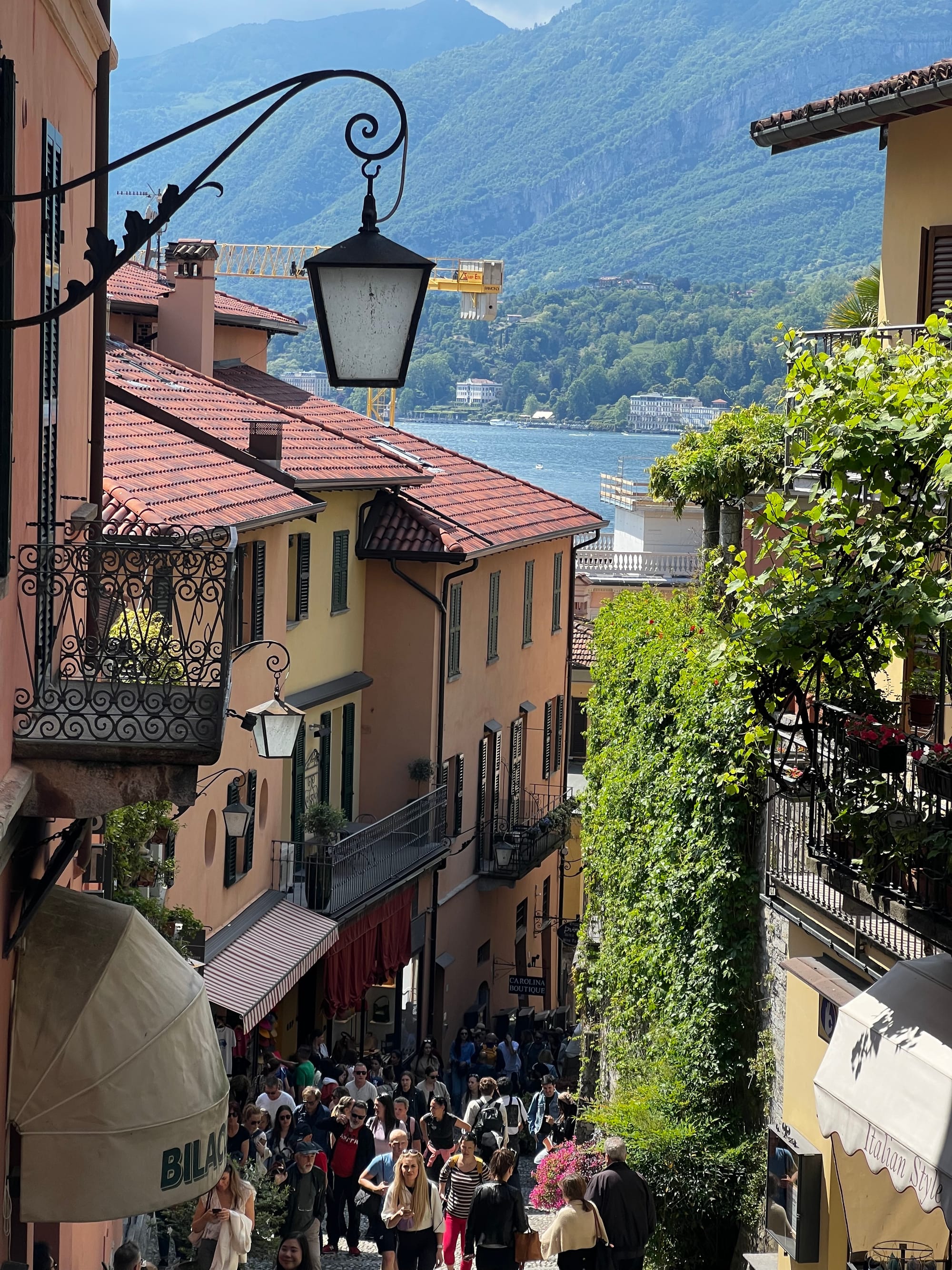 The ferry pulled up — it was very busy. We secured our place standing on the top deck with great views of Varenna when leaving the port. Watching the buildings getting smaller against the skyline, we headed for the town of Bellagio. The atmosphere on the ferry was building to discover this next well-known and most visited town, proudly named “The Pearl of Lake Como.”
