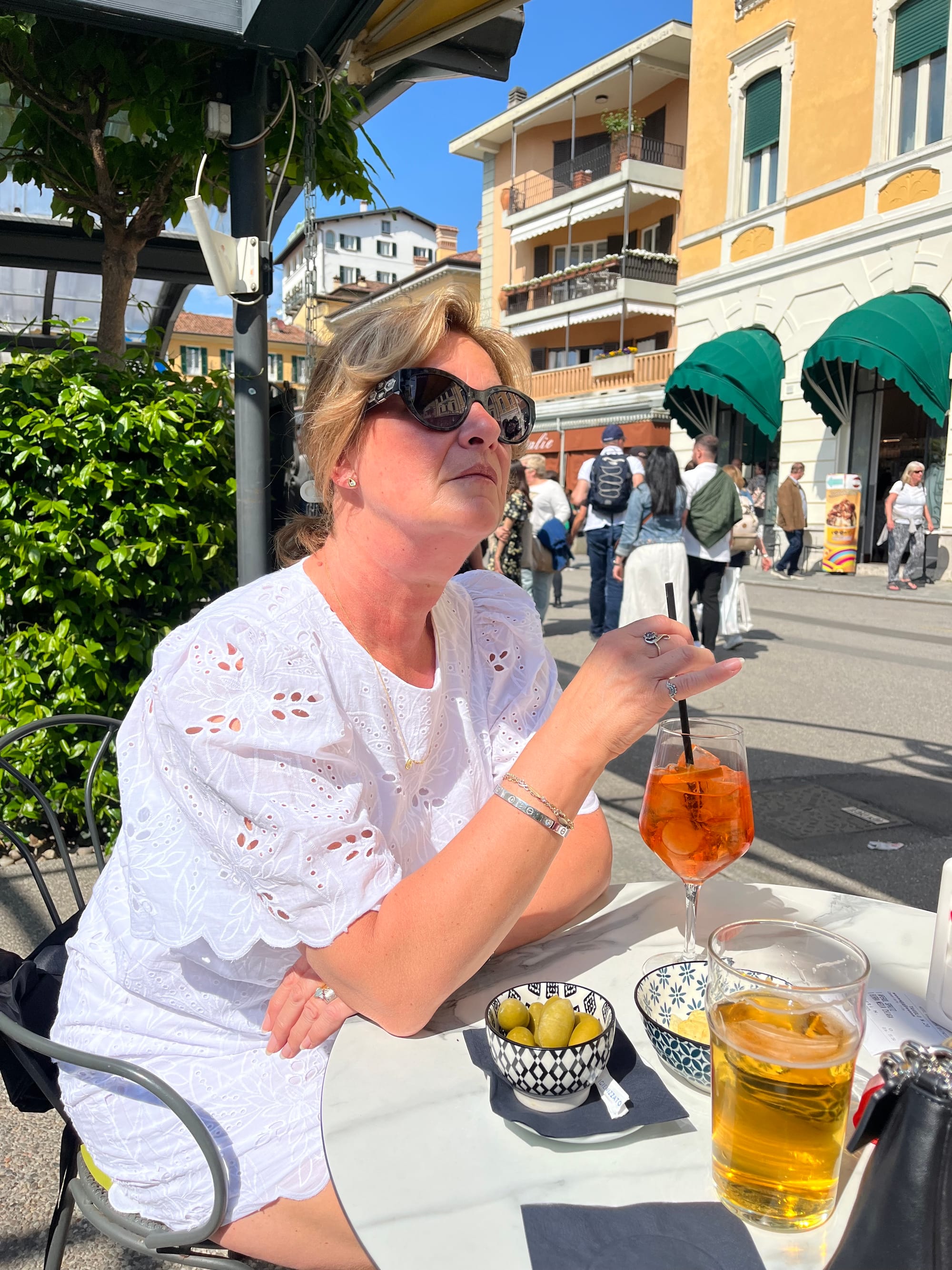 It was time to make our way back to the ferry port, as we were judging what time it would take to get back to the train station. I asked a gentleman who was a tour guide if the ferry that had just pulled in was going to Varenna. He told me it was not the one we needed and ours was not due in for half an hour, so he suggested we went for a drink. What a good idea… two more Aperol Spritz please!